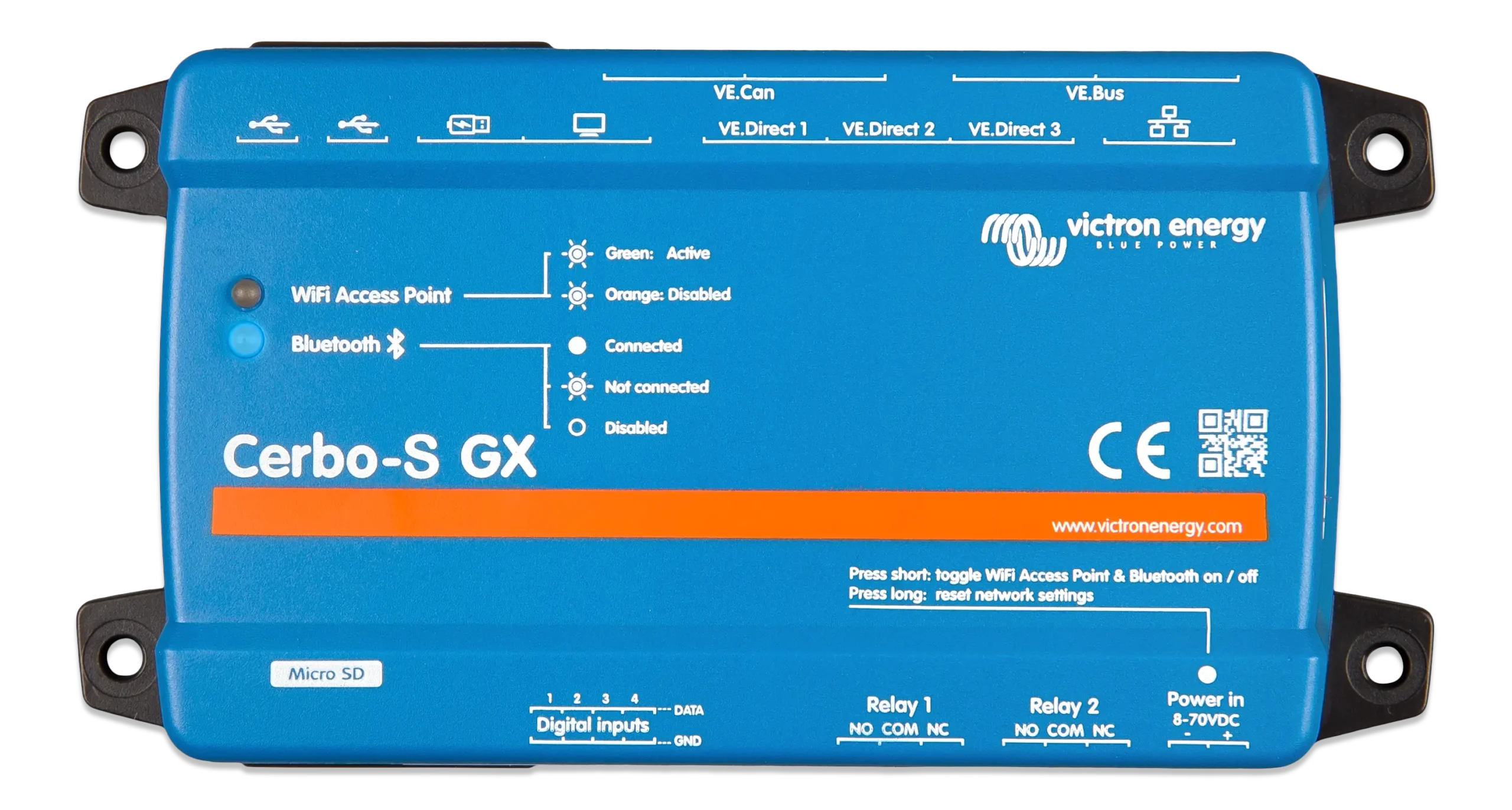 Märkus: saadaval on ka soodsam Cerbo-S GX mudel, mis sobib süsteemidele, mis ei vaja BMS-CAN bussi porte ega paagi- ja temperatuuriühendusi.